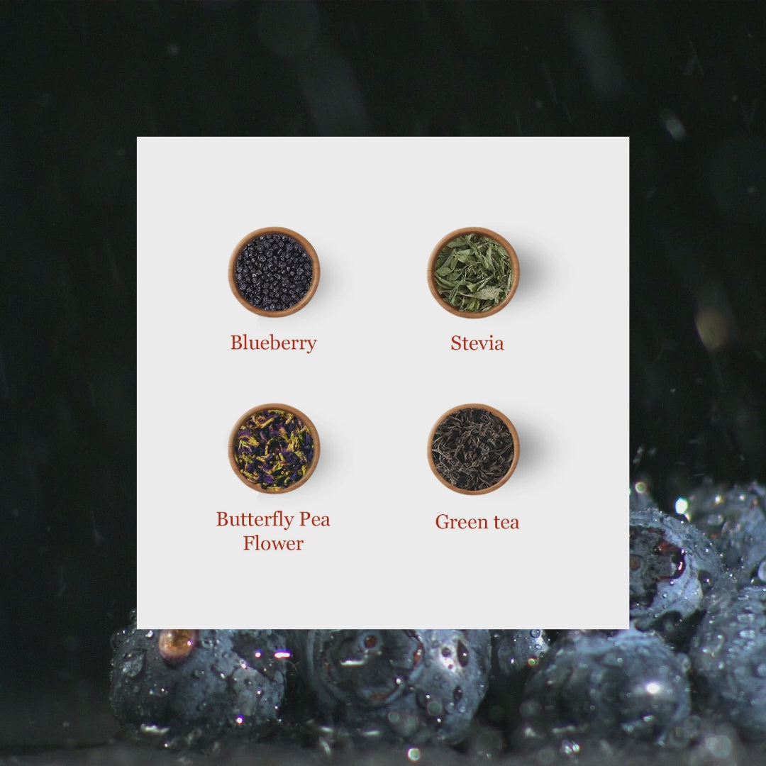 We bring a rich heritage to every cup — sourcing the finest leaves from India’s most esteemed estates. Our Blueberry Tea is thoughtfully crafted with Green tea from the Himalayan foothills and a curated blend of wellness botanicals.
